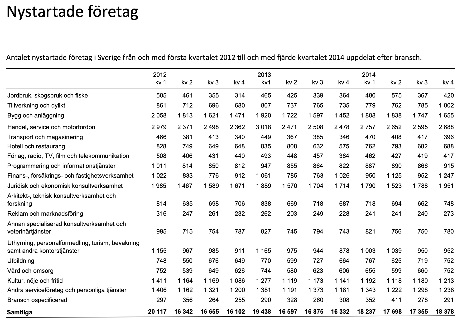 33. Identifiera det kvartal då flest företag startades. Hur stor andel av de redovisade branschkategorierna hade fler än 1 000 ny- startade företag detta kvartal?