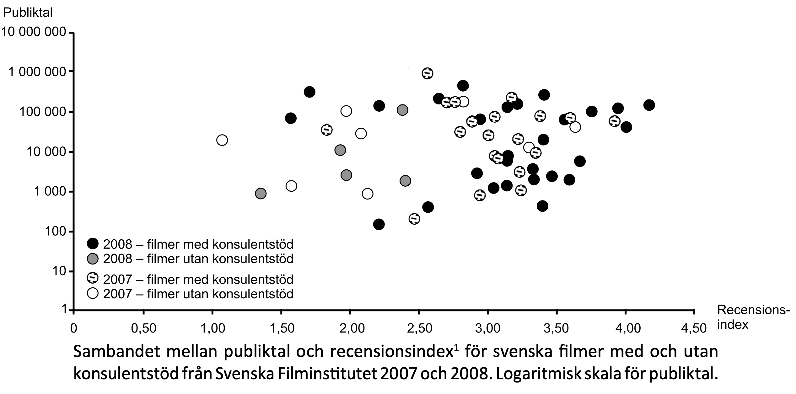 De filmer som ligger i det övre högra hörnet har både recensionsindex över 3,50 och publiktal över 100 000.