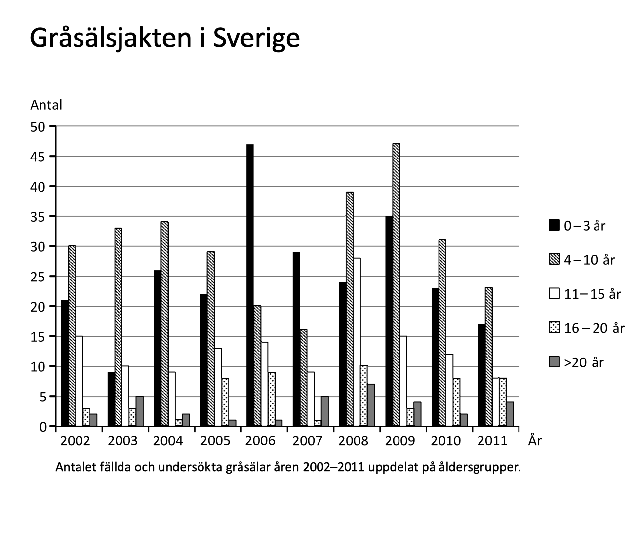 30. För hur många av åren gällde att antalet fällda och undersökta gråsälar i åldersgruppen 11–15 år var större än tio, samtidigt som motsvarande antal i åldersgruppen 16–20 år var mindre än fem?