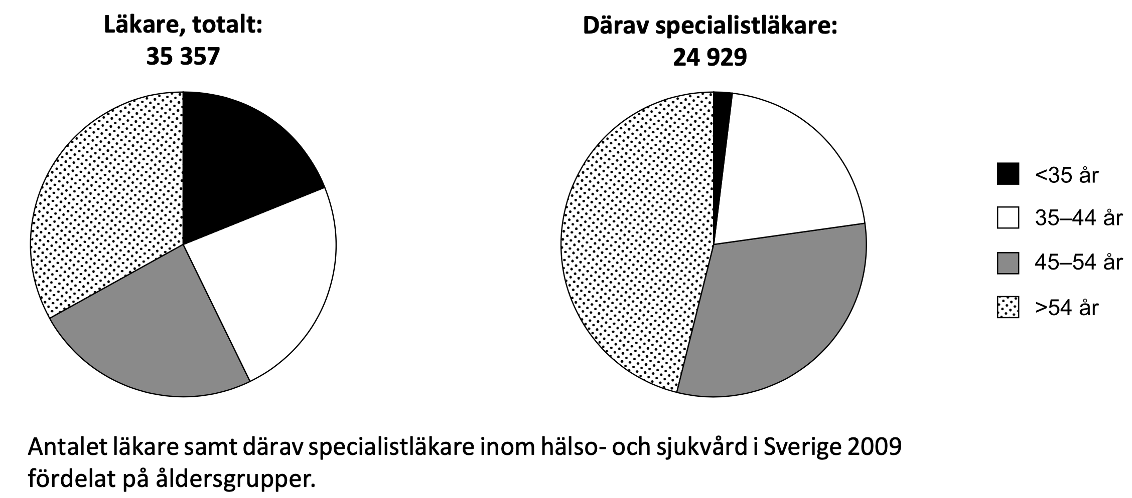 Det finns totalt dubbelt så många specialistsjuksköterskor som specialistläkare. Eftersom andelarna i det relevanta åldersintervallet är (nästan) lika stora, gäller det allmänna förhållandet även för denna grupp. Därför kan vi sluta oss till alternativ C, Dubbelt så stort.