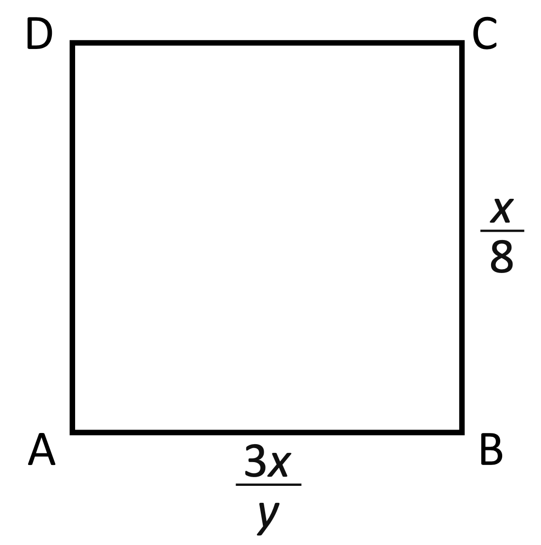En kvadrat betyder att alla sidor är lika långa. Alltså är \(\frac{3x}{y} = \frac{x}{8}\). Vi kan ta oss framåt genom att multiplicera upp nämnarna: