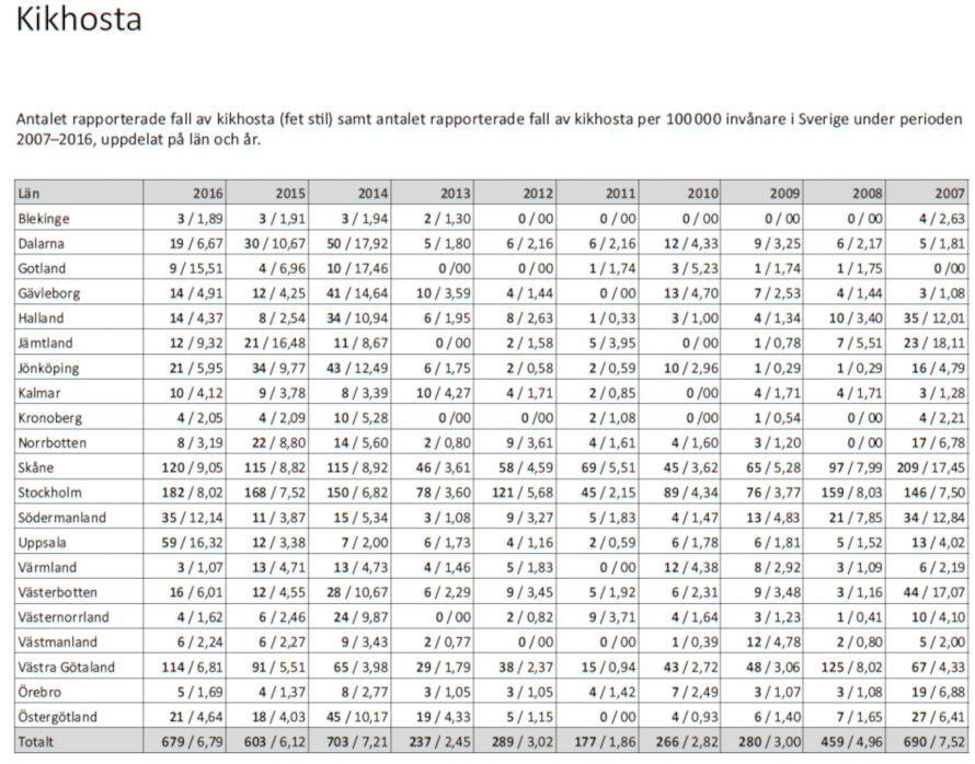 32. Hur många län hade år 2014 fler fall av kikhosta per 100 000 invånare än Sverige totalt?