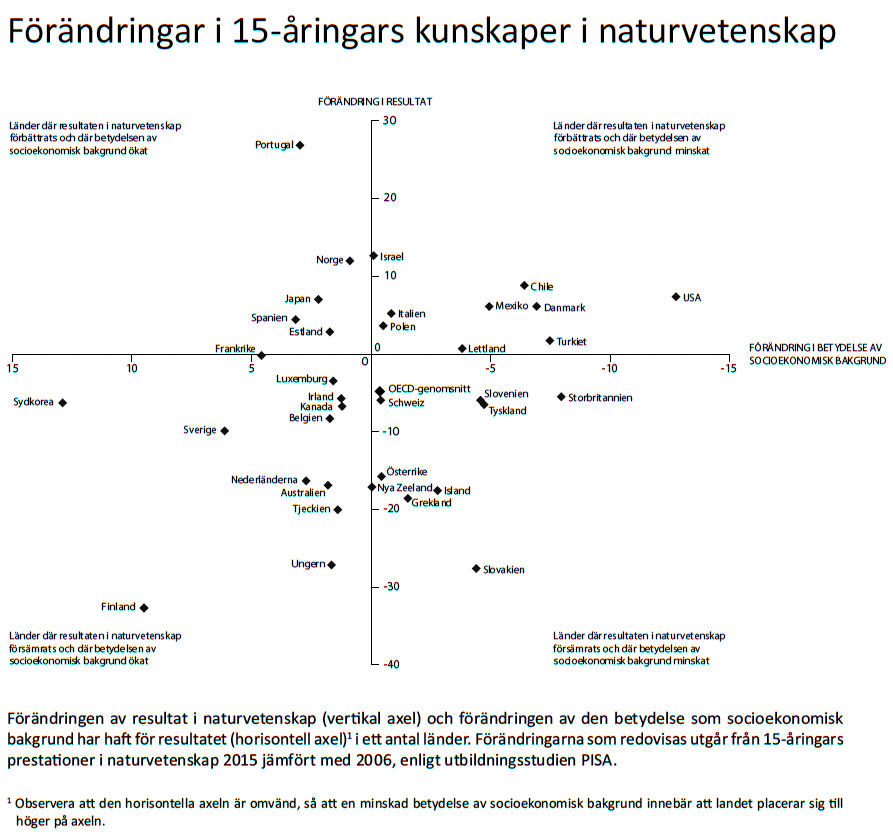 Resultaten i naturvetenskap hade försämrats med 1–10 skalsteg samtidigt som betydelsen av socioekonomisk bakgrund hade minskat med mer än 5 skalsteg.