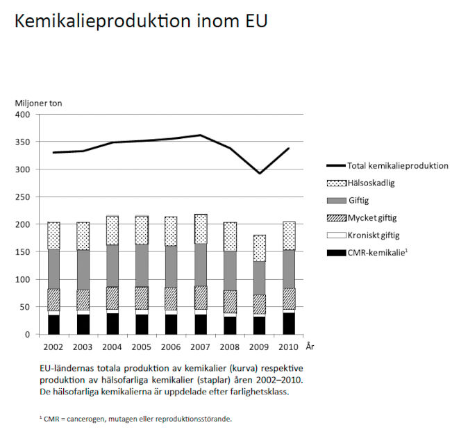 Cirka en tredjedel av kemikalieproduktionen utgjordes av farlighetsklasserna Giftig, Mycket giftig och Kroniskt giftig.