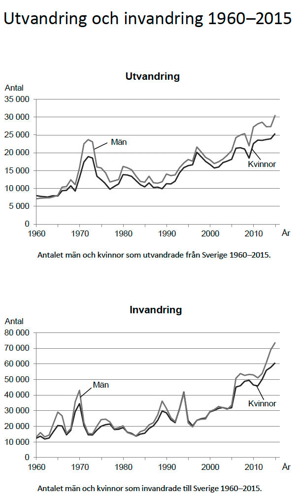 Invandringen för kvinnor låg på ca 47 000 och män 51 000 och tillsammans 98 000. Utvandringen för män låg på 25 000 och kvinnor på 20 000 och tillsammans 45 000. Skillnaden på ut- och invandring blir då ca 50 000